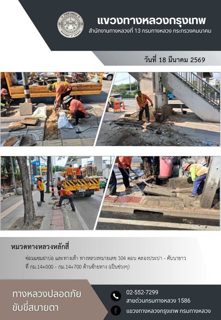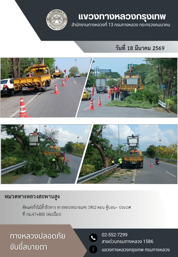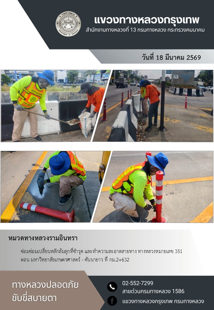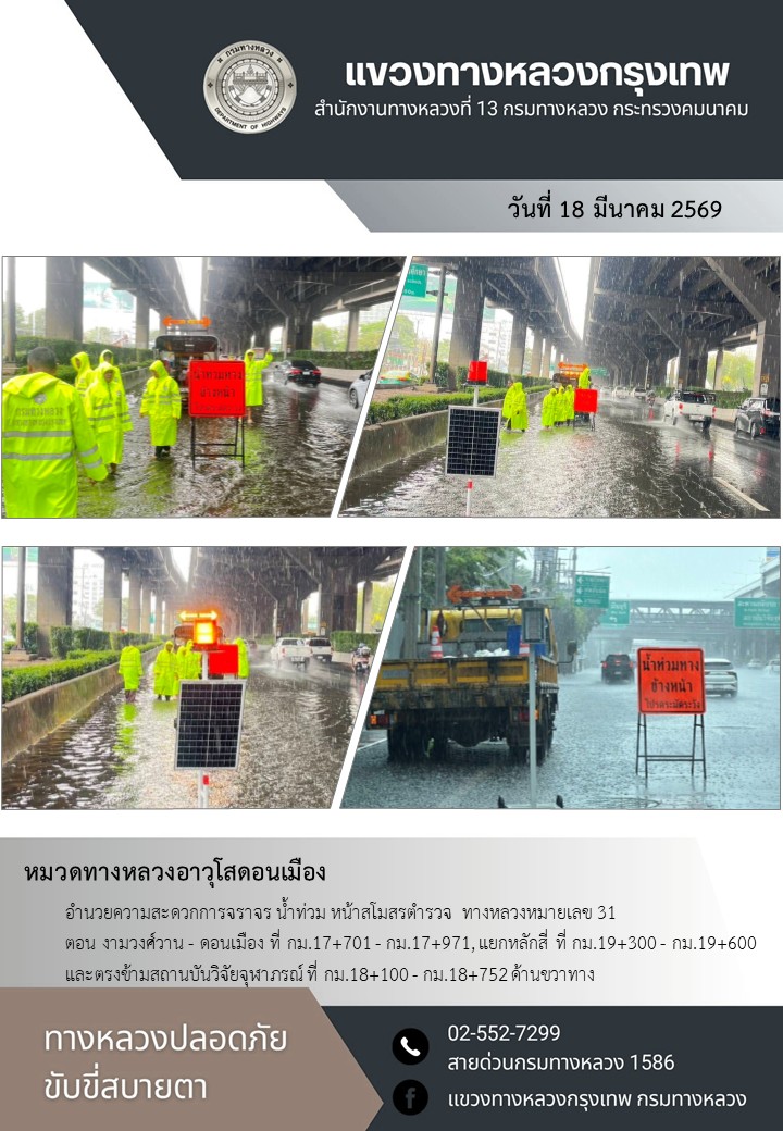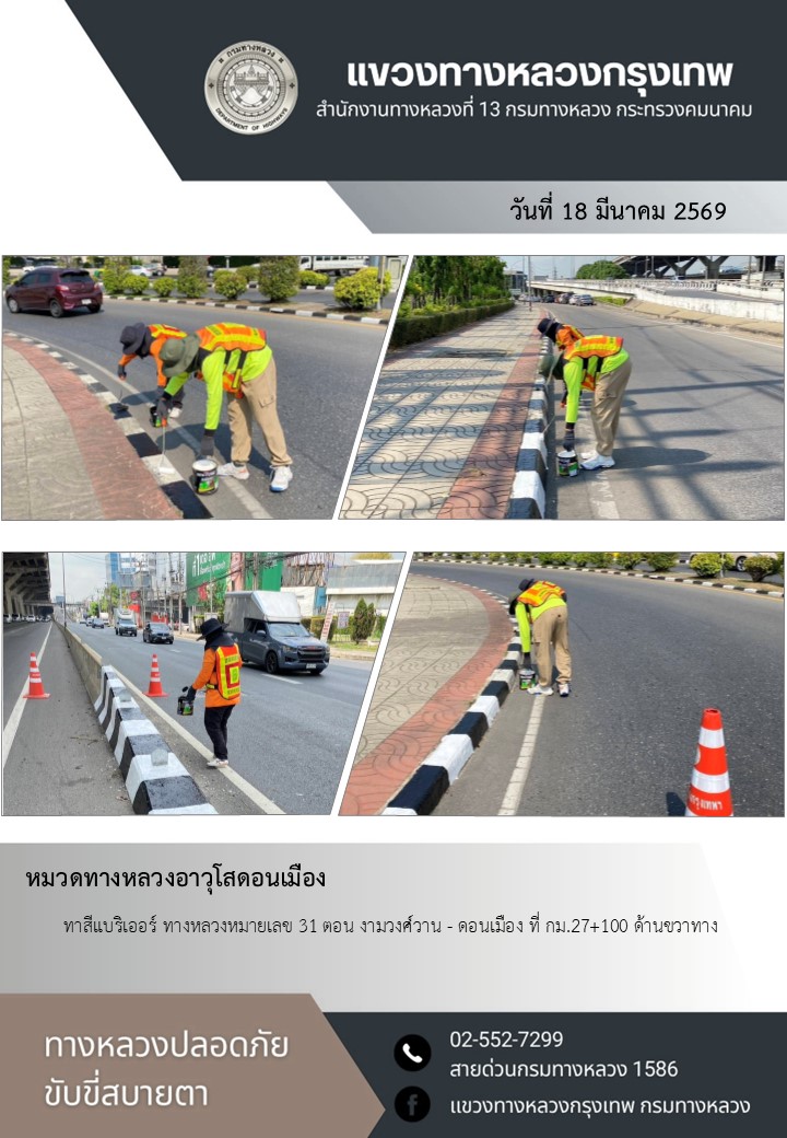 "ทางหลวงปลอดภัย ขับขี่สบายตา แขวงทางหลวงกรุงเทพ" ประจำวันที่ 18 มีนาคม 2569